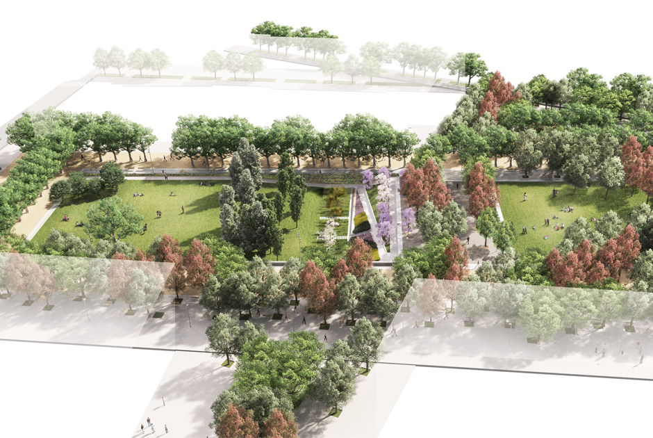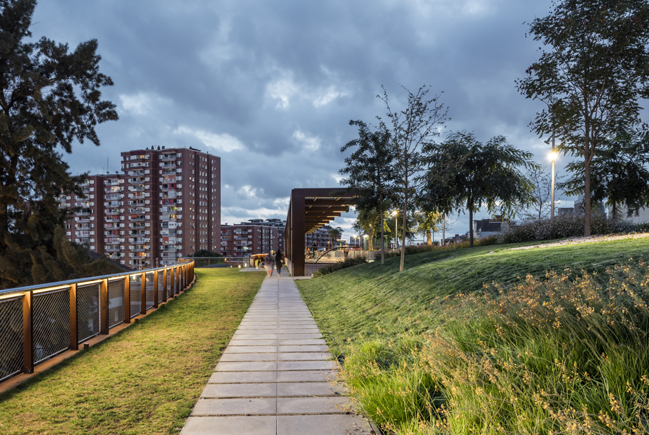 La disposición de taludes y recorridos peatonales permiten la creación de un espacio urbano de calidad en el que el eje central se percibe como un amplio paseo verde sobre la cubierta del corredor ferroviario, reconvirtiendo este espacio degradado en un foco de centralidad para el barrio de Sants; un gran corredor verde que une y enlaza tanto en sentido longitudinal como transversal los espacios libres resultantes del área ferroviaria.
