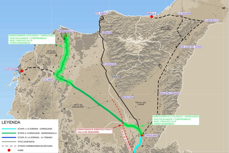 • La Dorada – Chiriguaná: rehabilitación de la línea, operación en trocha angosta y paso a trocha estándar