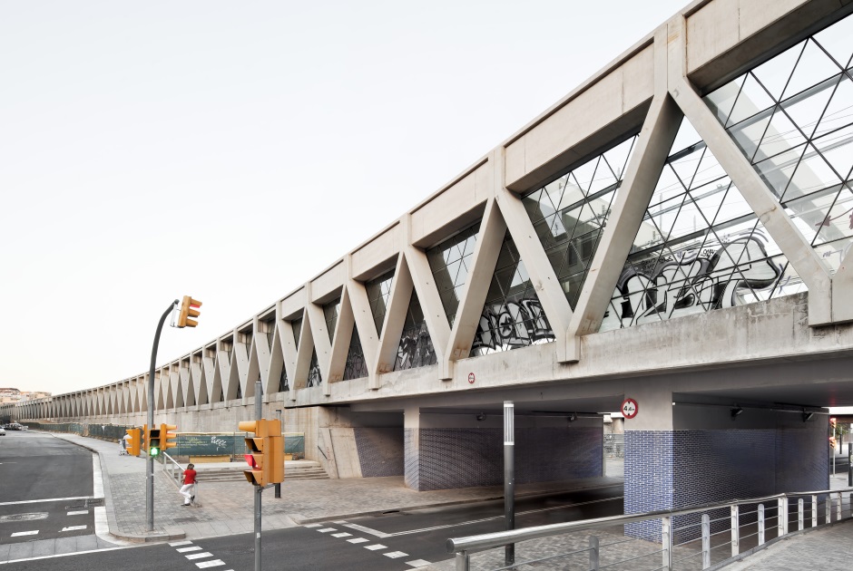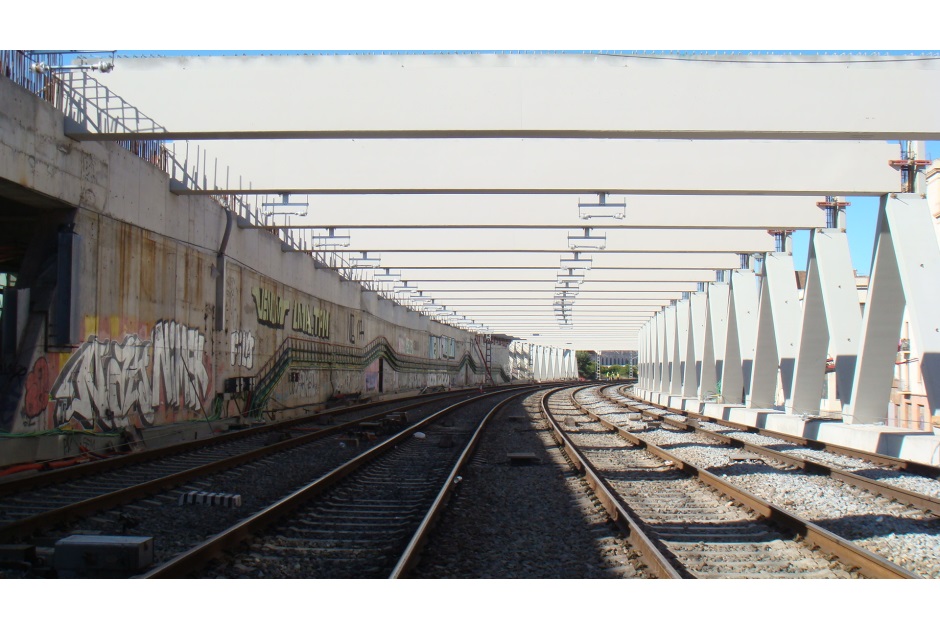 La cobertura del corredor ferroviario de acceso a la estación de Sants, fue un objetivo perseguido durante largo tiempo por el Ayuntamiento de Barcelona, de cara a mejorar las condiciones ambientales de ruido, vibraciones y efecto barrera sobre la permeabilidad transversal que sufrían los barrios de la zona sur de la estación. El proyecto se desarrolla estableciendo la ejecución de una cubierta a doble altura, de unos 760 metros de longitud y una superficie de 22.500 m2. Los cerramientos laterales de la cubierta, que generan una fachada de más de 11.300 m2 de superficie, están constituidos en su mayor parte por un muro diagonalizado de hormigón prefabricado, utilizando vidrio para cerrar los espacios diáfanos entre las piezas o cerramientos opacos en el caso que se prevea un revestimiento de muro vegetal.