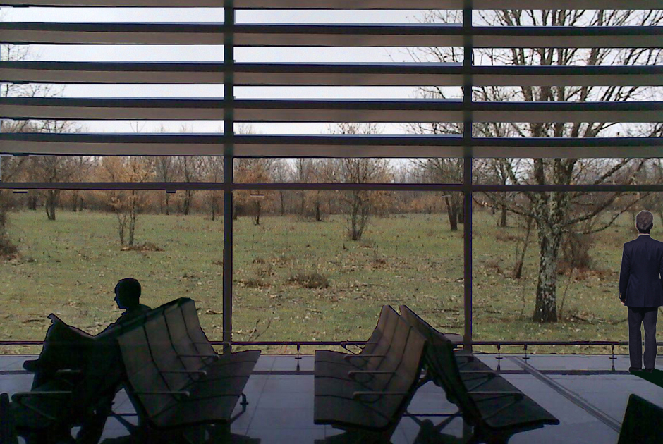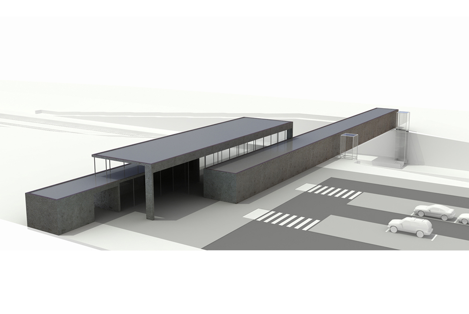 El edificio de viajeros de 500 m2 se organiza en un solo nivel adaptado a la topografía existente y a la misma cota que el viario de acceso, de forma que se reducen y facilitan los movimientos del viajero. Se dispone en perpendicular a la plataforma ferroviaria y se une con la pasarela peatonal conformando un volumen único, en un gesto que pretende ofrecer una fachada de mayor entidad y escala al viajero. Buscando una referencia visual y permitir una mejor orientación desde el vial de acceso. No hay que olvidar que la estación se encuentra en un paraje natural prácticamente virgen.