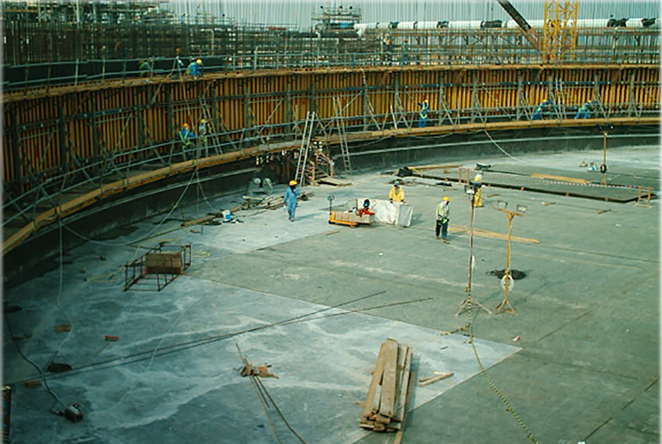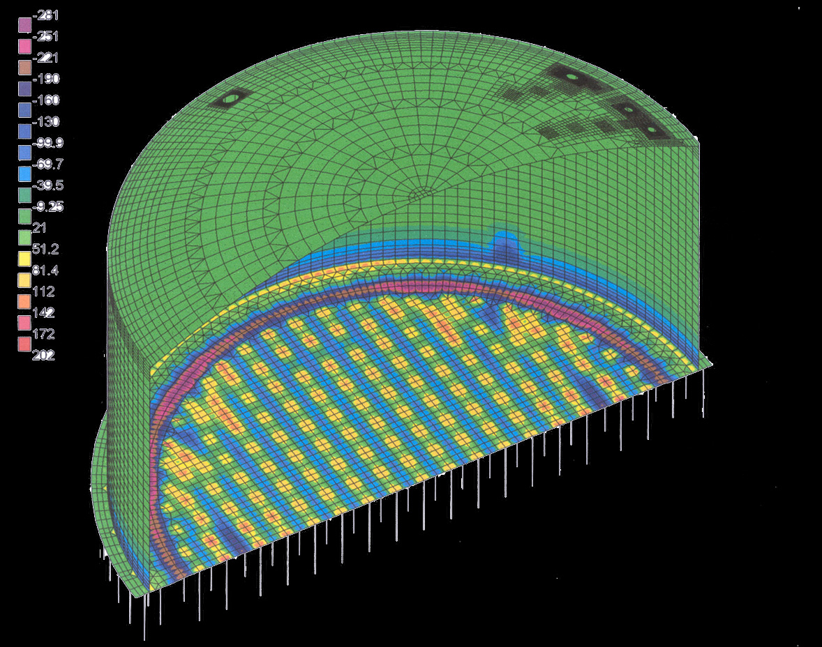 Some of the most significant features of these structures are: a monolithic joint of the foundation piles to the bottom slab with a constant thickness of 0.80 and 1.15m; the fact that the 0.80 m thick perimeter wall is embedded into the bottom slab; postensioning by means of horizontal and vertical cables of the perimeter wall and a reinforced concrete dome with minimum thickness of 0.40m embedded in the ring that culminates the perimeter wall with two-layered concrete.